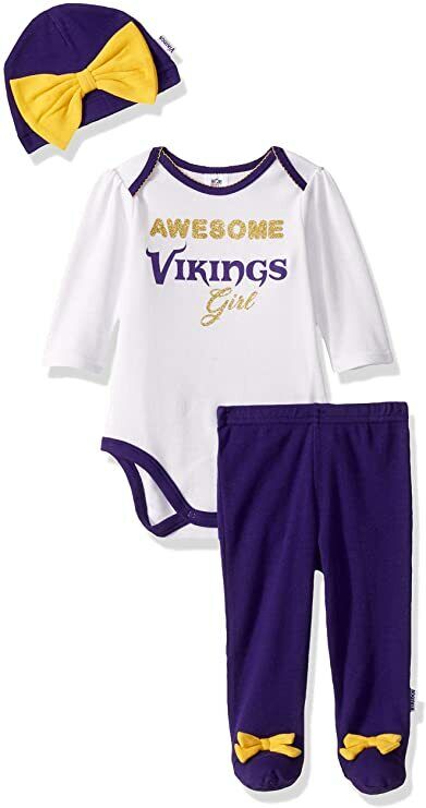NFL Minnesota Vikings Girls 3 Pack Bodysuit Footed Pant & Cap Set 3-6 Month